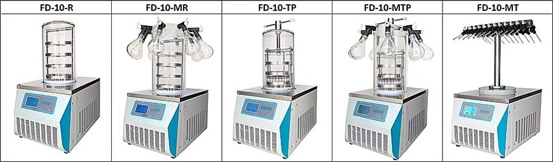 Серия включает в себя следующие конфигурации: 1) R - с цилиндрической сушильной камерой; 2) MR - с цилиндрической сушильной камерой + с 8-ми портовым манифолдом с колбами; 3) TP - с цилиндрической сушильной камерой + верхняя укупорка; 4) MTP - с цилиндрической сушильной камерой + с 8-ми портовым манифолдом с колбами + верхняя укупорка; 5) MT - с Т-образным мультипортовым манифолдом.